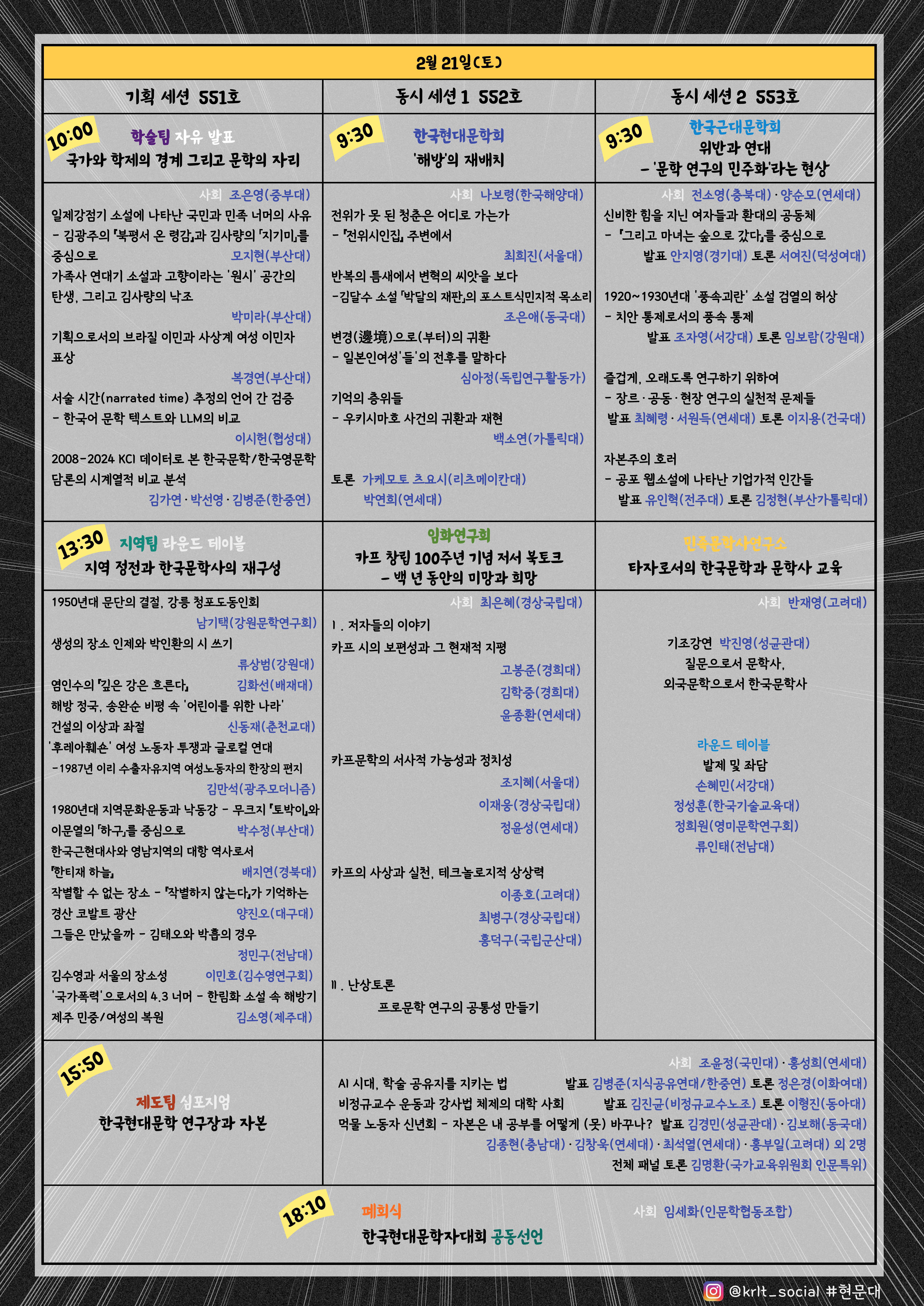 μ€μ 10μλΆν° 'κ΅κ°μ νμ μ κ²½κ³ κ·Έλ¦¬κ³ λ¬Ένμ μ리' ν¬μ€ν° μμ λ°ν! "'ν΄λ°©'μ μ¬λ°°μΉ"(νκ΅νλλ¬Ένν), "λ¬Έν μ°κ΅¬μ λ―Όμ£Όν"(νκ΅κ·Όλλ¬Ένν) λ± νμ±ν μΈμ μ΄ κ°λ~
